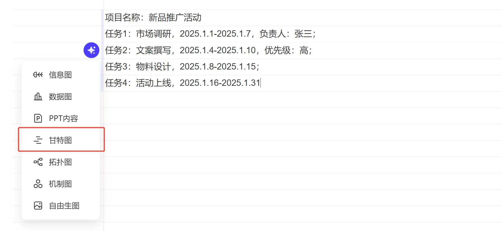 示例:“項目名稱:新品推廣活動;任務(wù)1:市場調(diào)研,2025.1.1-2025.1.7,負責(zé)人:張三;任務(wù)2:文案撰寫,2025.1.4-2025.1.10,優(yōu)先級:高;任務(wù)3:物料設(shè)計,2025.1.8-2025.1.15;任務(wù)4:活動上線,2025.1.16-2025.1.31”。