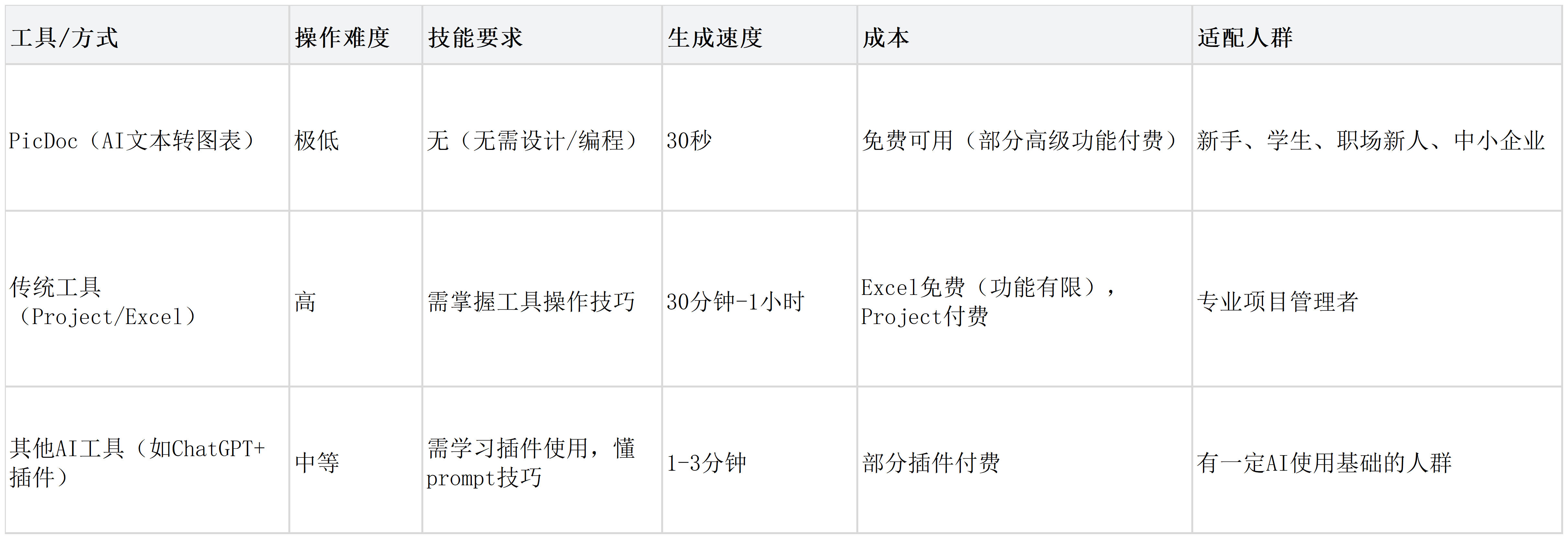 不管是職場人整理項目規(guī)劃,還是小老板統(tǒng)籌活動流程,AI都能幫你省去手動繪制的麻煩。而像PicDoc這類AI文本轉(zhuǎn)圖表工具,更是把操作簡化到極致,支持甘特圖、流程圖等多種圖例,零門檻就能上手,完美解決新手做圖難的痛點。