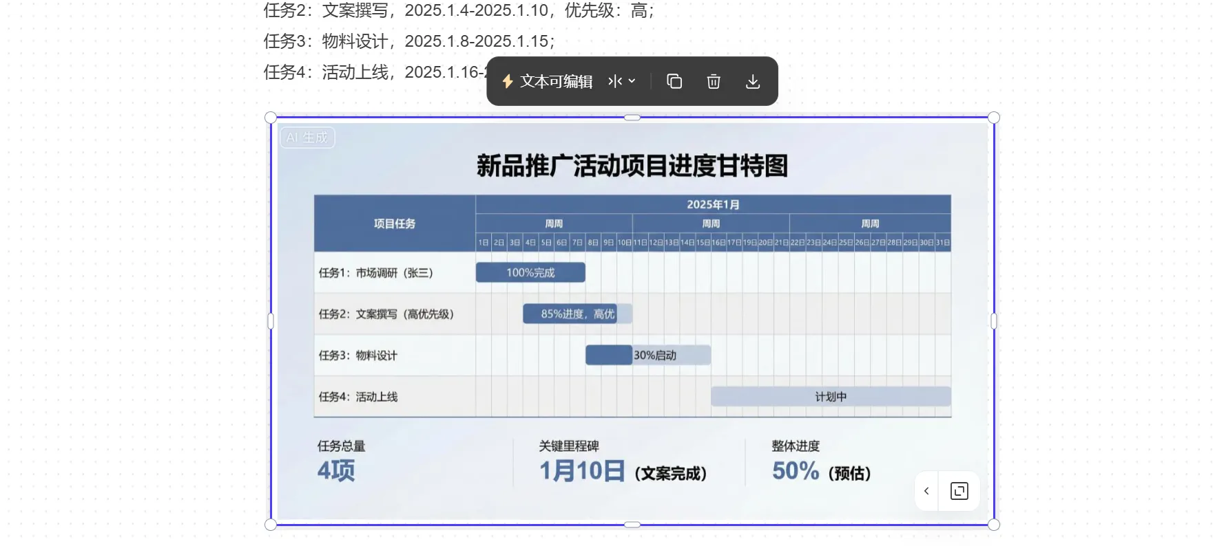 可以。用PicDoc生成后,可分離文本,直接在線修改任務(wù)名稱、起止時間、負責(zé)人等信息,修改后直接下載,無需重新生成。