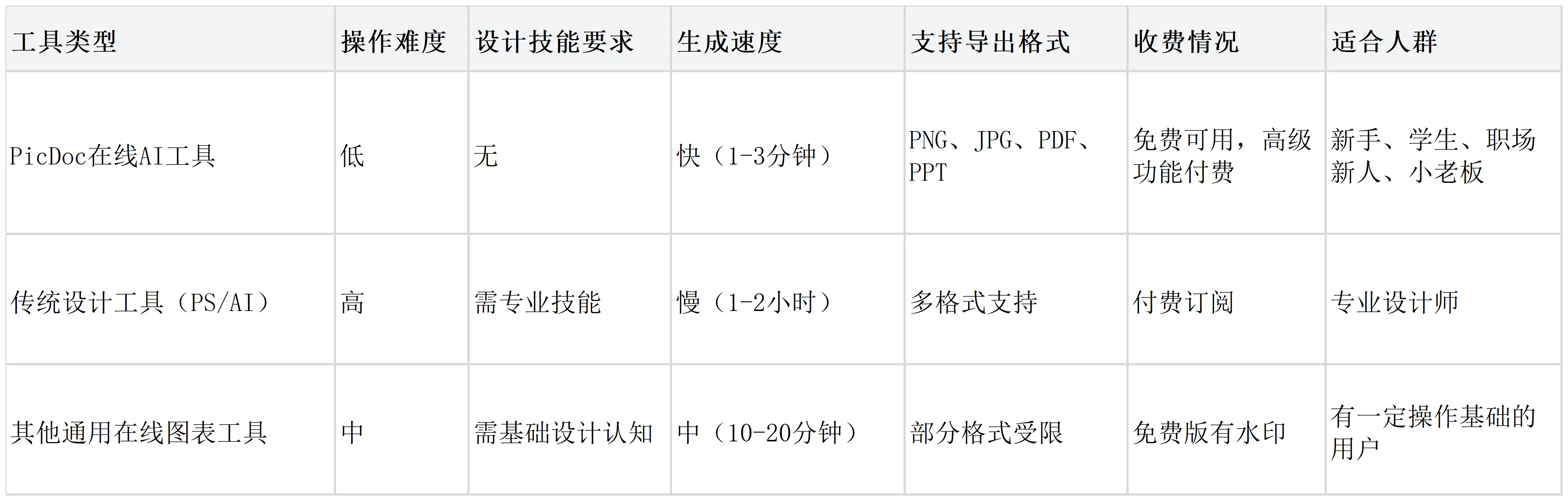 2. 工具技巧:根據(jù)需求選擇,優(yōu)先選在線工具,無需下載安裝;;例如PicDoc支持在線生成、多格式導(dǎo)出,適配不同使用場(chǎng)景。