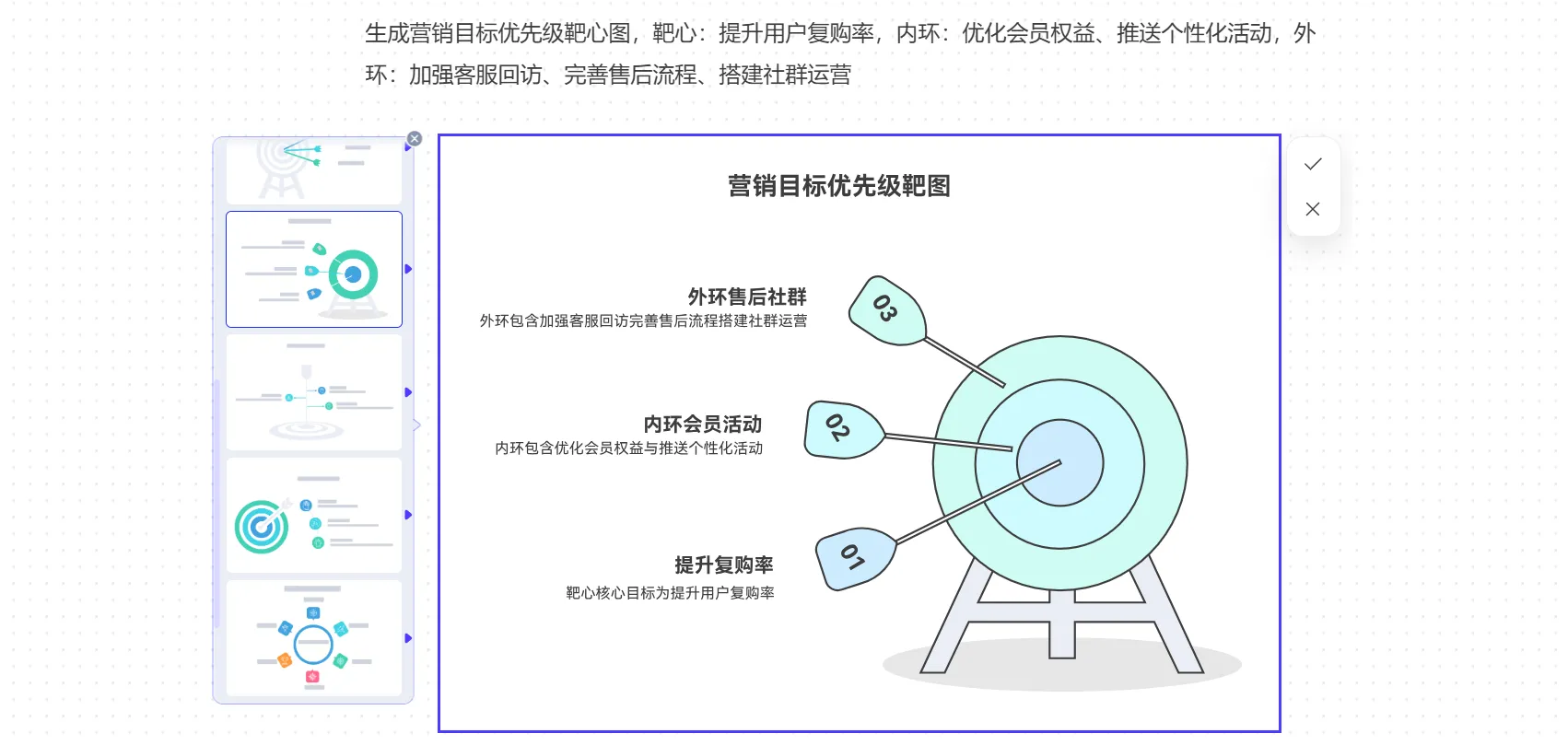 正確做法:明確場(chǎng)景、靶心、內(nèi)環(huán)、外環(huán)信息,如“生成電商營(yíng)銷靶心圖,靶心:提升銷售額,內(nèi)環(huán):優(yōu)化商品詳情頁、投放精準(zhǔn)廣告,外環(huán):開展直播帶貨、發(fā)放優(yōu)惠券、搭建用戶社群”。