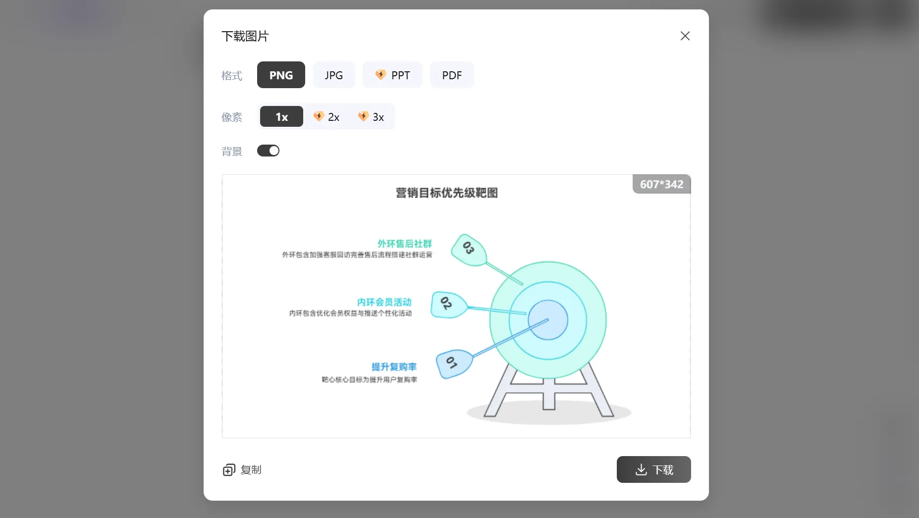 優(yōu)化完成后,點(diǎn)擊“下載”按鈕,可選擇PNG、JPG、PDF、PPT等多種格式:PNG、JPG適合插入PPT、文檔,PDF適合打印,PPT適合直接演示使用。PicDoc支持無水印下載和尺寸調(diào)整,滿足職場(chǎng)、教育等多種場(chǎng)景使用需求。