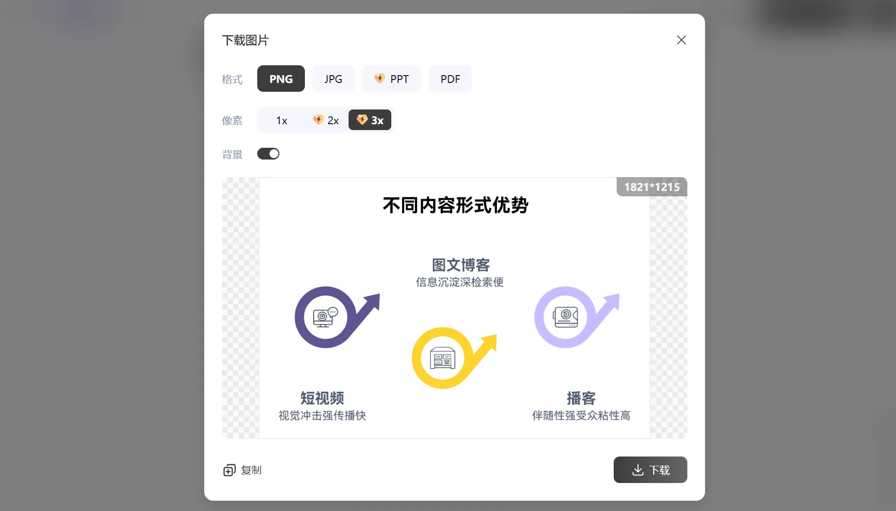 解決辦法:根據使用場景選擇導出格式。PPT演示優(yōu)先選高清PNG或PPT,文件打印可選PDF,文檔或自媒體排版可選PNG/JPG。