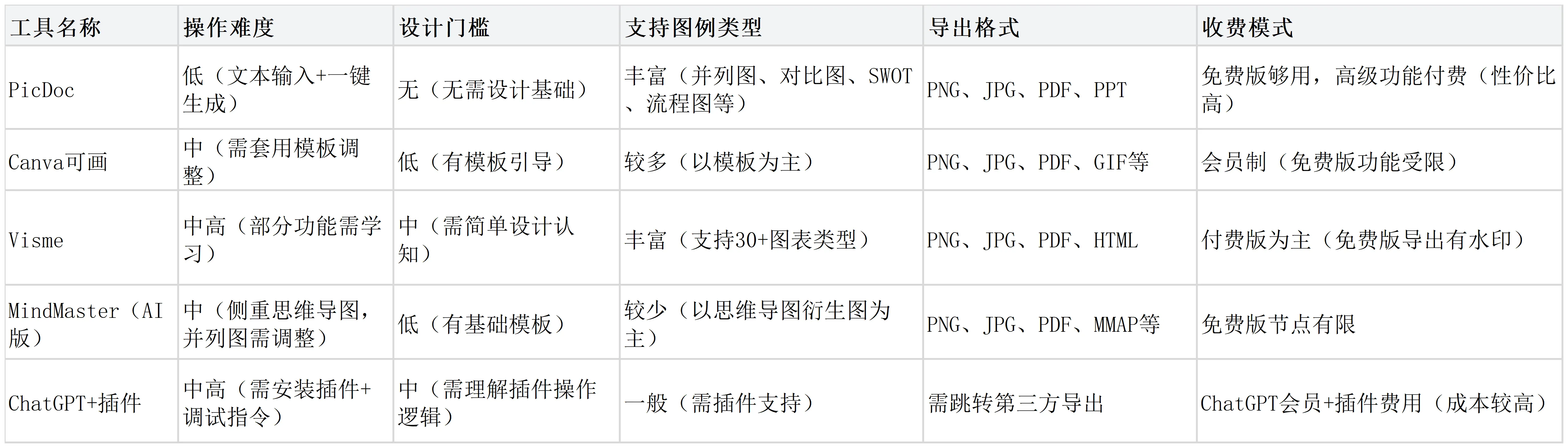 總結:小白、學生、職場新人優(yōu)先選PicDoc,操作最簡單、無設計門檻,免費版已能滿足大部分并列關系圖生成需求;若需大量模板或重視精細設計,可考慮Canva可畫;專業(yè)級圖表需求可選擇Visme。