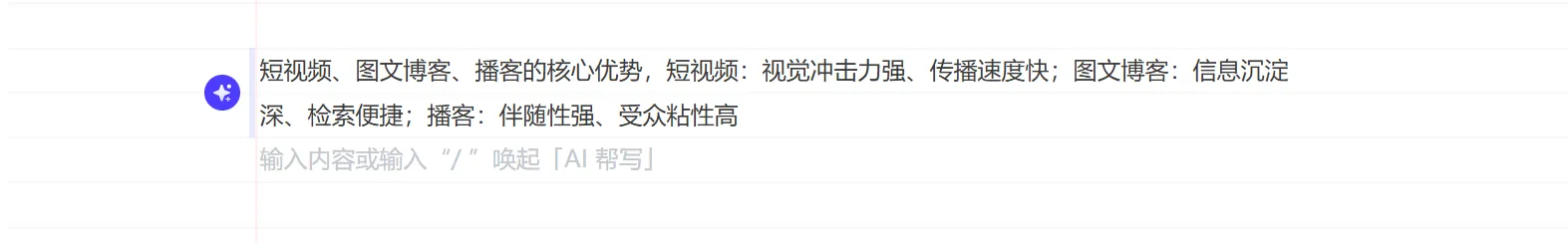 在編輯頁中清晰寫出“并列元素+核心信息”。比如輸入:“短視頻、圖文博客、播客的核心優(yōu)勢,短視頻:視覺沖擊力強、傳播速度快;圖文博客:信息沉淀深、檢索便捷;播客:伴隨性強、受眾粘性高”