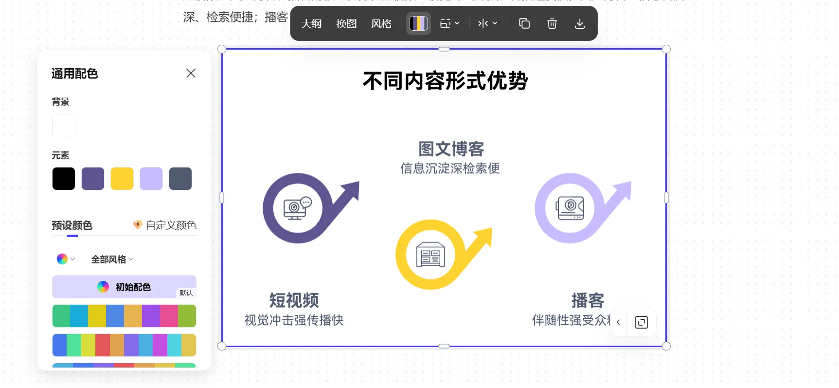 生成圖表初稿后,若需調整字體大小、顏色、圖標等等元素,可直接在編輯頁面點擊修改(單擊整個圖表或特定元素后會出現(xiàn)編輯欄);若對生成的文本內容不滿意,可雙擊修改文本,或從“大綱”調整項目順序。