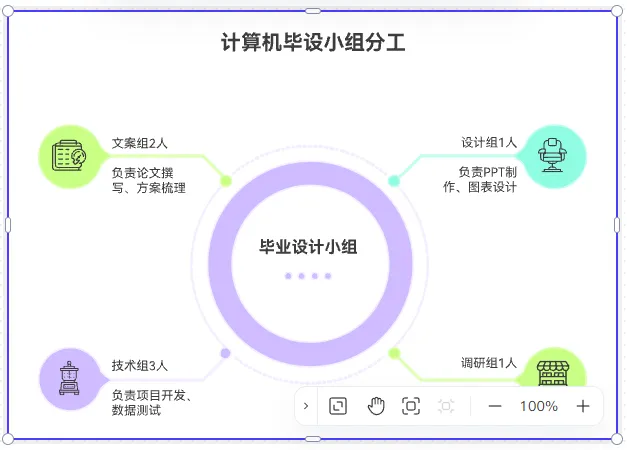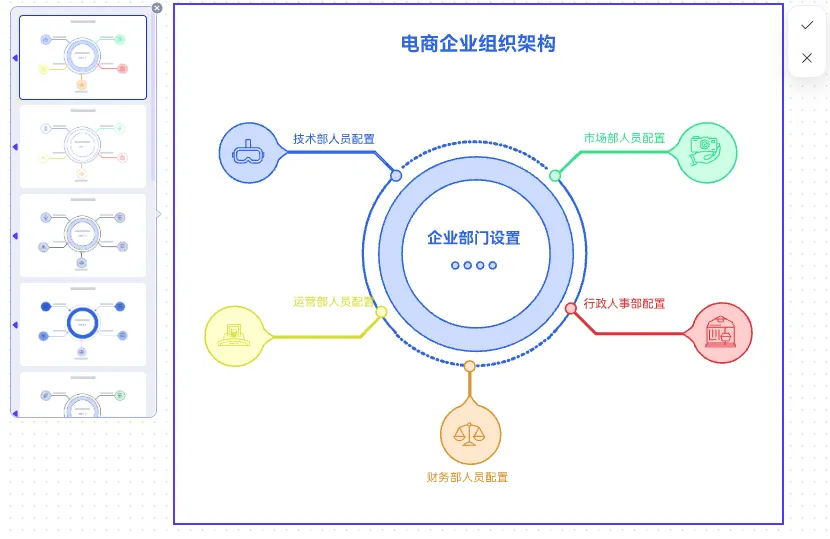 信息輸入完成后,框選文本內(nèi)容,點(diǎn)擊 “生成” 按鈕即可啟動(dòng) AI 解析。通常 1-3 秒內(nèi)即可完成圖表生成,AI 會(huì)自動(dòng)優(yōu)化排版邏輯,用不同顏色區(qū)分部門(mén)類(lèi)別(如運(yùn)營(yíng)部橙色、技術(shù)部藍(lán)色),并匹配適配崗位的圖標(biāo),無(wú)需人工調(diào)整格式。