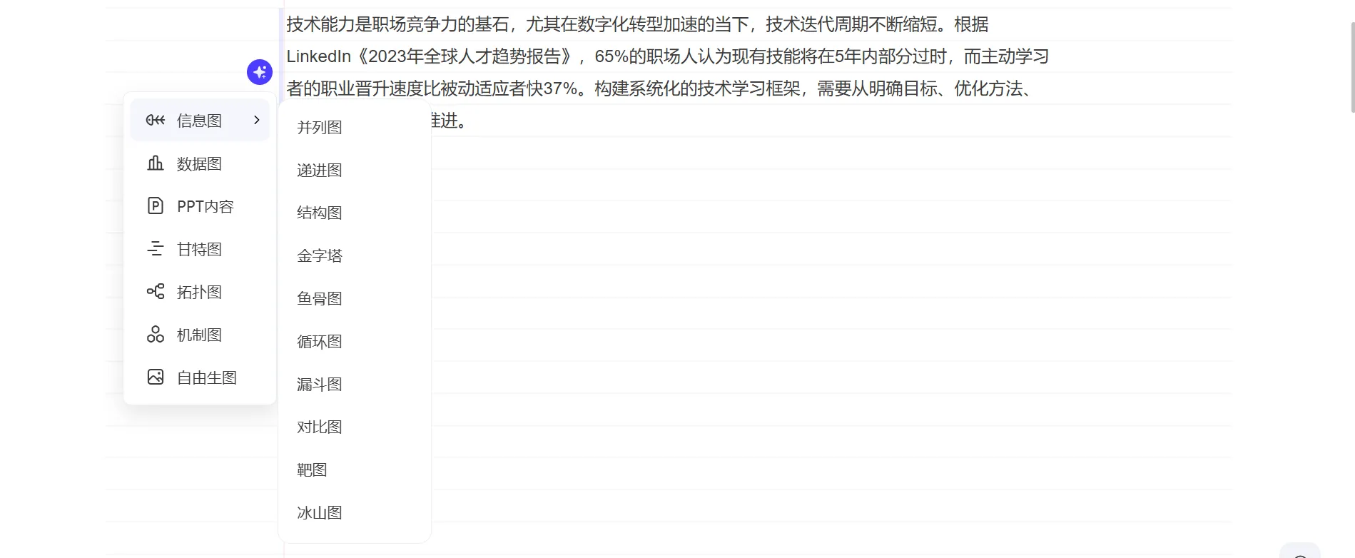 將鼠標懸浮在生圖按鈕上,就能看到清晰的圖表類型選擇列表。你可以從信息圖或數(shù)據(jù)圖表中,直接點選具體的圖表類型。