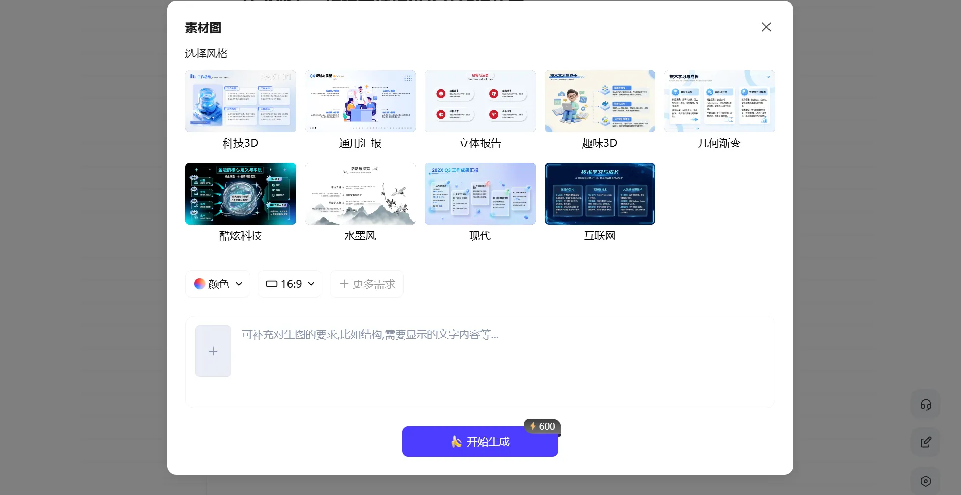 生成時可以選擇不同風(fēng)格和主題色,也可以上傳參考圖,讓AI在結(jié)構(gòu)和視覺風(fēng)格上進行借鑒。